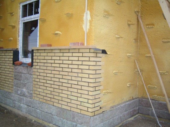 Un mur de brique décoratif est érigé simultanément avec un mur porteur pour la simple raison qu'un revêtement avec un poids aussi solide devrait également reposer sur la fondation. De plus, sa largeur doit être conçue de manière à prévoir un emplacement pour la pose de l'isolant, ainsi qu'un espace de ventilation d'au moins trois centimètres.