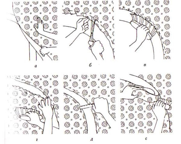 - Les bandes suivantes sont également collées avec une tolérance de 2,5 cm. Ensuite, découpez les coins dans les tolérances avec des ciseaux pour qu'il n'y ait pas de rides, et adhérez à l'arche, en lissant soigneusement avec une brosse.