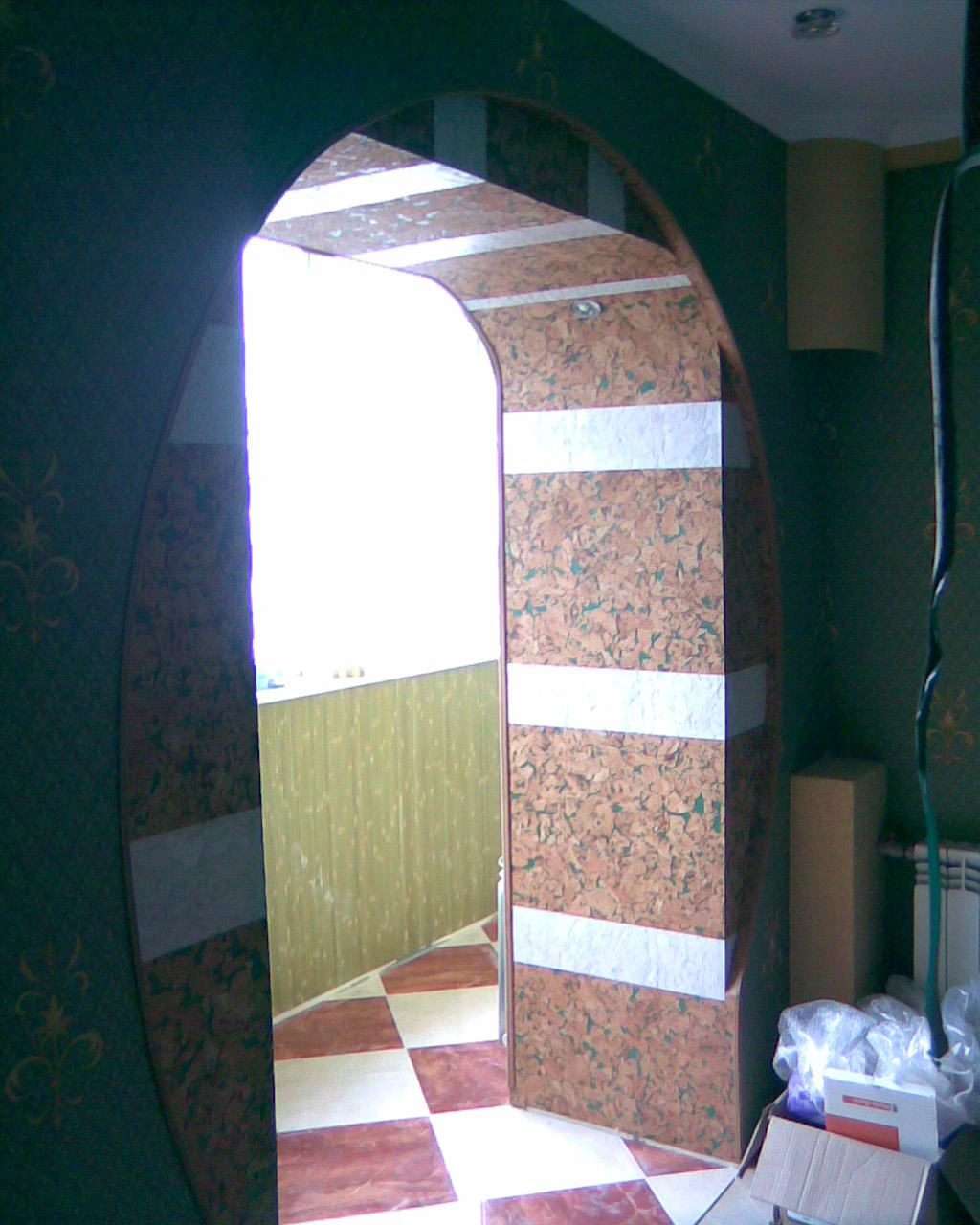 - Il est plus facile d'effectuer un travail lors de la décoration des ouvertures cintrées avec du papier peint en liège sur une base auto-adhésive, mais vous pouvez simplement acheter un rouleau de liège avec contact ou de la colle acrylique.