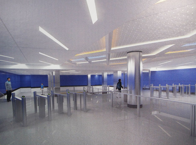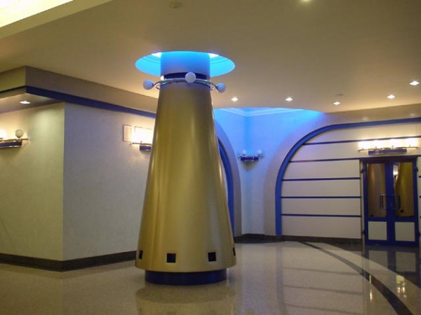 La photo montre un exemple de projet de conception d'une colonne utilisant du métal et un rétroéclairage.