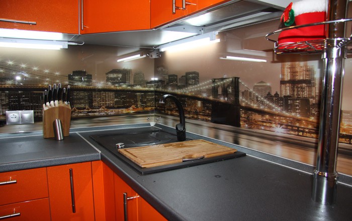 Malgré le fait que le verre est caractérisé comme un matériau fragile, un tablier en sera très pratique et durable, car des verres d'une certaine épaisseur sont sélectionnés pour lui. La photo montre un exemple d'une telle finition.