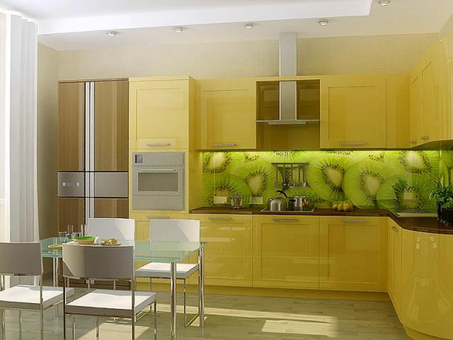 Pointe. Sous les panneaux de verre sur le tablier de la cuisine, vous pouvez faire un éclairage supplémentaire sous la forme de petits appareils d'éclairage. Tout cela est original et insolite.
