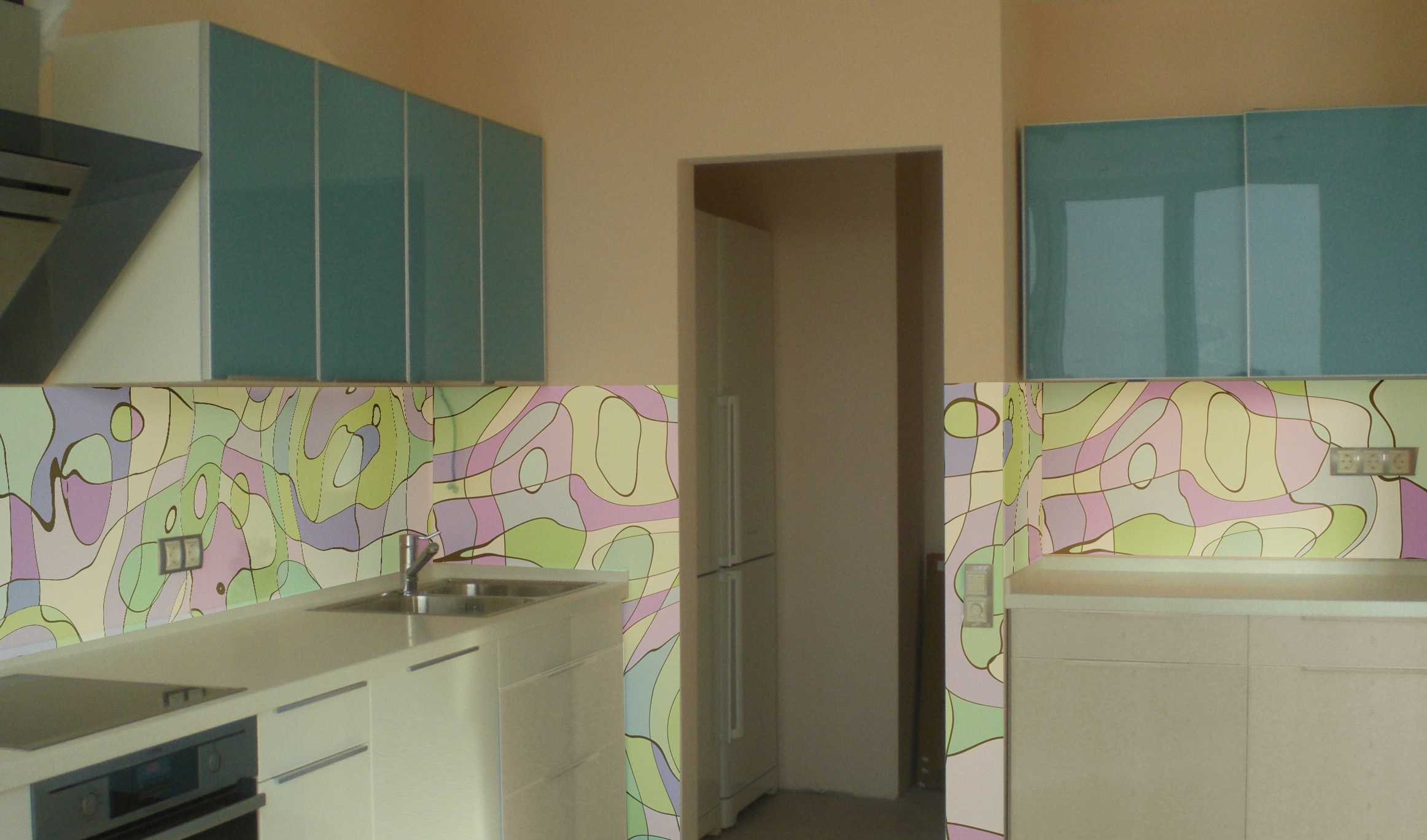 Je n'avais jamais entendu parler de ce genre de finition auparavant, comme un skinhead. La première chose qui m'est venue à l'esprit est très pratique. Le verre n'absorbe aucune impureté, est facile à nettoyer et donne une surface exceptionnellement plate. Et à propos de la variété des dessins et des schémas de couleurs, il n'y a rien à dire. Je pense que cette décoration peut être combinée avec n'importe quel style de cuisine choisi, de la haute technologie à la Provence et à la campagne.