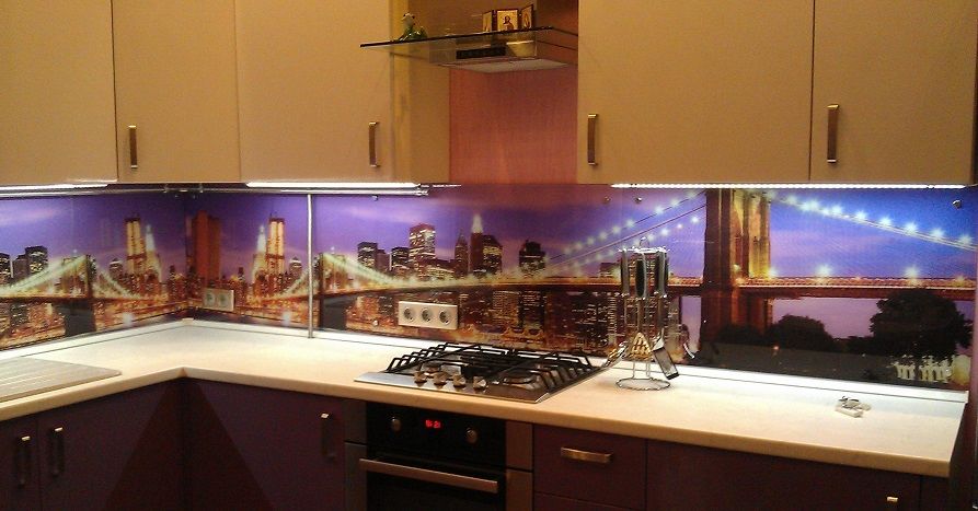 La couleur du panneau est généralement assortie à la façade de la cuisine ou est combinée avec des garnitures de meubles. Il a fière allure et est doté d'un rétro-éclairage, surtout s'il représente le monde sous-marin ou, par exemple, une ville de nuit.