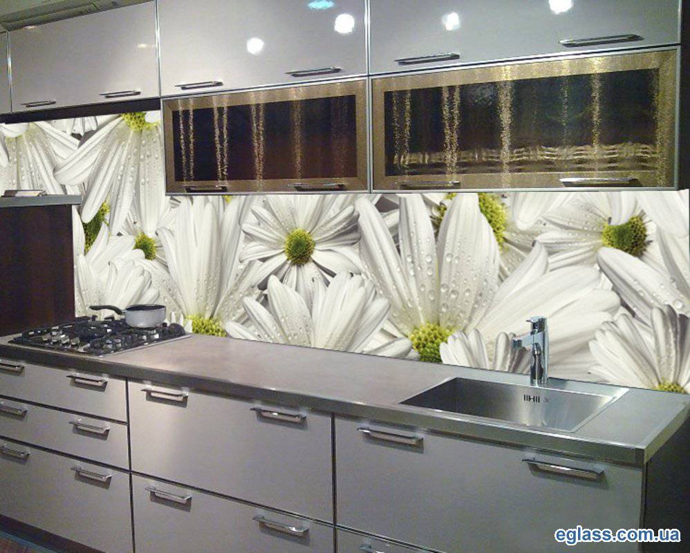 - Le verre pour la décoration murale de la cuisine présente plusieurs avantages par rapport aux autres types de décoration. Il s'agit d'un processus de fabrication rapide et d'une technologie d'installation simple; la possibilité de créer n'importe quelle forme et dessin; à bas prix.