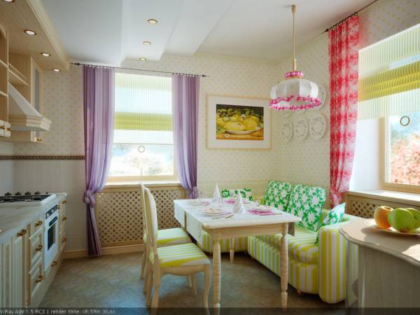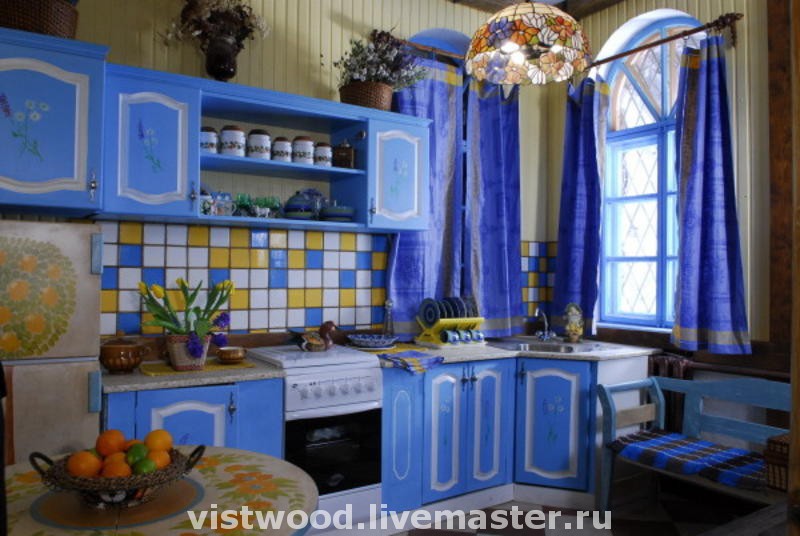 Dans notre exemple, la décoration de la cuisine de la maison de campagne est exactement ce qui a été fait. Des carreaux séparés sur le mur de travail et des rideaux bleu vif de la couleur du casque complètent l'intérieur, le rendant particulièrement attrayant.