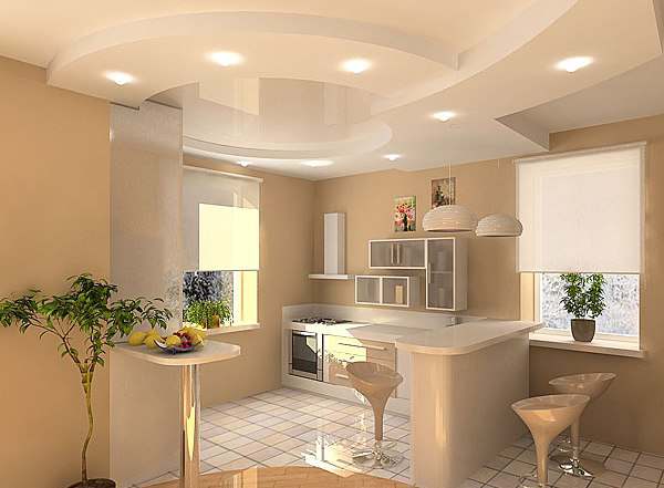 La décoration principale de l'intérieur de cette cuisine est le plafond suspendu d'origine en gypro et chaises inhabituelles en harmonie avec les lampes.