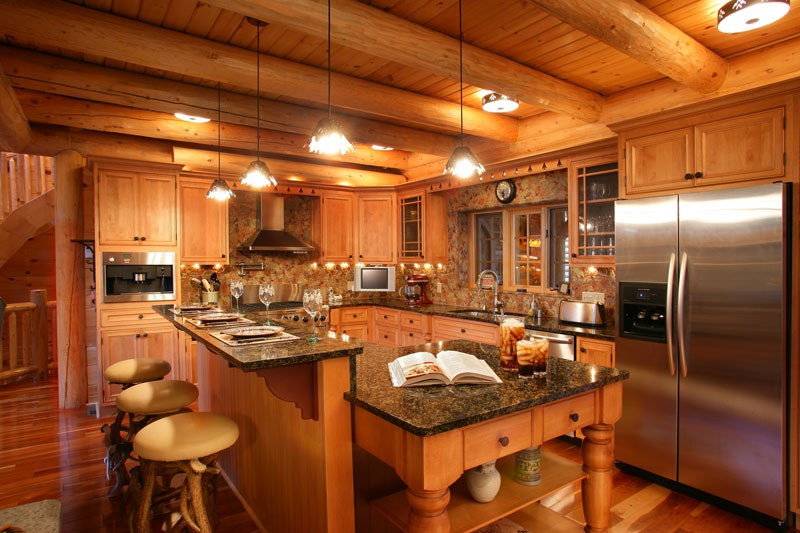 La finition de la cuisine dans une maison en bois peut être réduite au raffinement des surfaces de base des murs, du plafond et des structures de support.