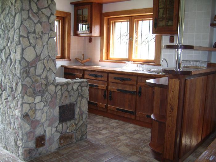 Un excellent complément à l'intérieur de toute cuisine dans une maison de campagne est un poêle ou une cheminée russe, garni de pierre décorative. Sans cela, la décoration murale de la cuisine d'une maison en bois n'est pas terminée.