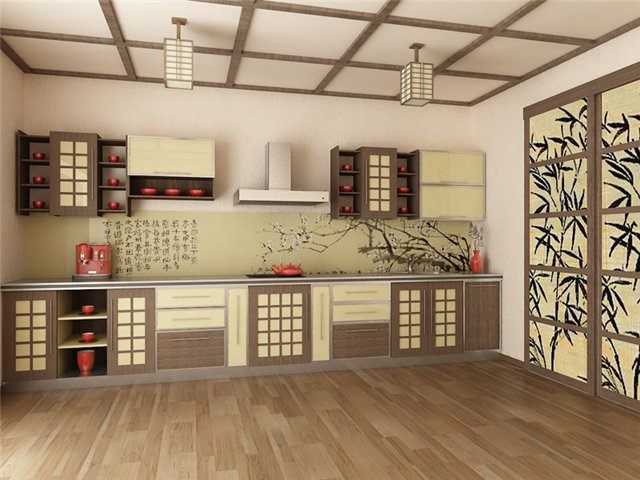 - Le matériau le plus approprié pour une telle finition serait un parquet en bambou et en liège ou des panneaux de bois avec placage de bambou pour les murs. Dans la cuisine japonaise, même les plats en bambou.