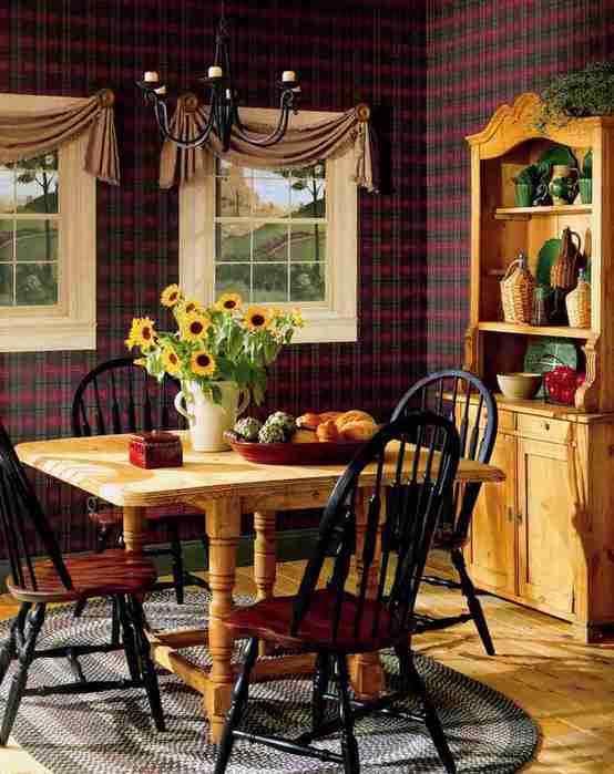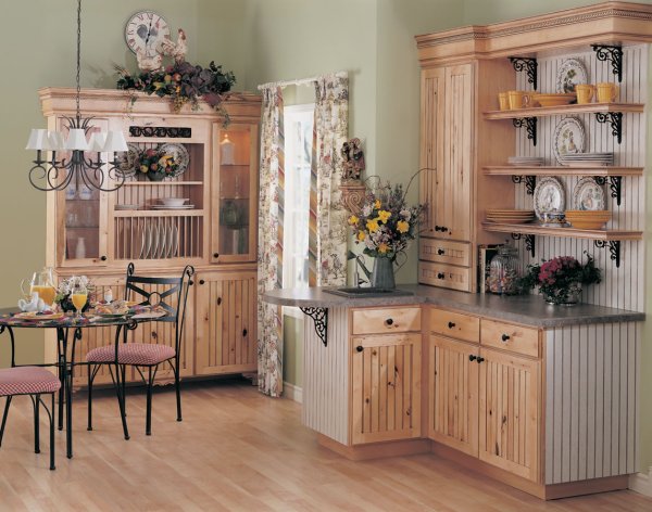 Ici, la pierre et la céramique peuvent être utilisées. La haute technologie dans ce style est totalement inappropriée. - Dans l'intérieur rustique, il devrait y avoir de petites fenêtres avec des rideaux courts et au lieu des chaises, bancs et tabourets habituels. La décoration principale de la cuisine peut être un poêle en faïence, des ustensiles en fonte et en argile placés sur des étagères ouvertes.