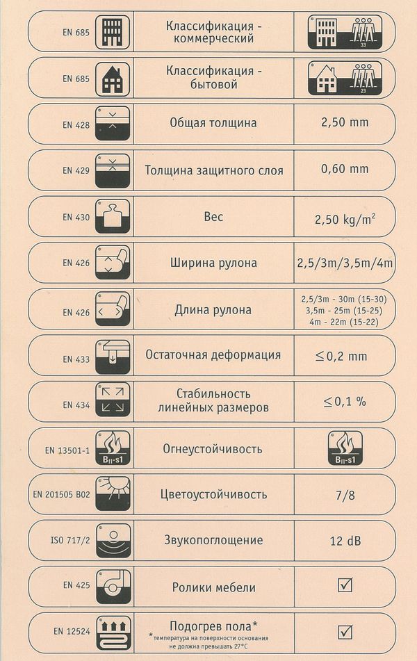 Après avoir déterminé la classe de linoléum avant l'acquisition, nous arrivons à la conclusion à quel point l'échantillon sélectionné convient à une pièce particulière. Le fabricant a un pictogramme sur l'emballage comme un indice qui vous aidera à naviguer le but du revêtement à une personne peu familière avec les désignations numériques de la classe du linoléum.