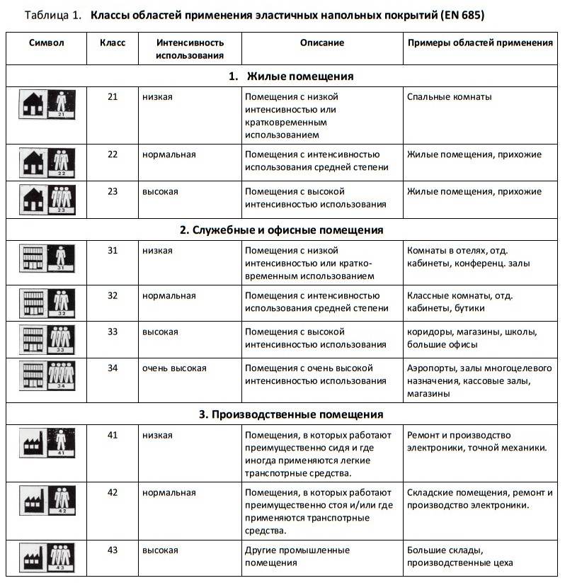 Depuis 1995, dans notre pays, la classe de résistance à l'usure du linoléum est déterminée selon la classification EN 685 développée dans l'Union européenne. Il régule également les conditions dans lesquelles il est recommandé de faire fonctionner le matériau. Selon cette norme, chaque modèle de couverture reçoit un numéro à deux chiffres. La première figure indique le type de pièce pour laquelle les propriétés de ce linoléum sont suffisantes. Pour les locaux résidentiels - 2 (ménage). Pour le bureau - 3 (semi-commercial et commercial), pour la production - 4 (spécial). Le deuxième chiffre (de 1 à 4) indique l'intensité de la charge que le revêtement supportera sans dommage.