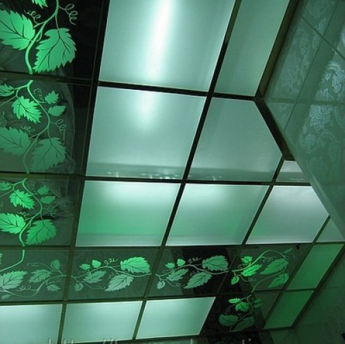 L'utilisation de panneaux de plafond en verre est récemment devenue utilisée pour les bureaux. Ce type de matériau à la surface du plafond semble très original et inhabituel.