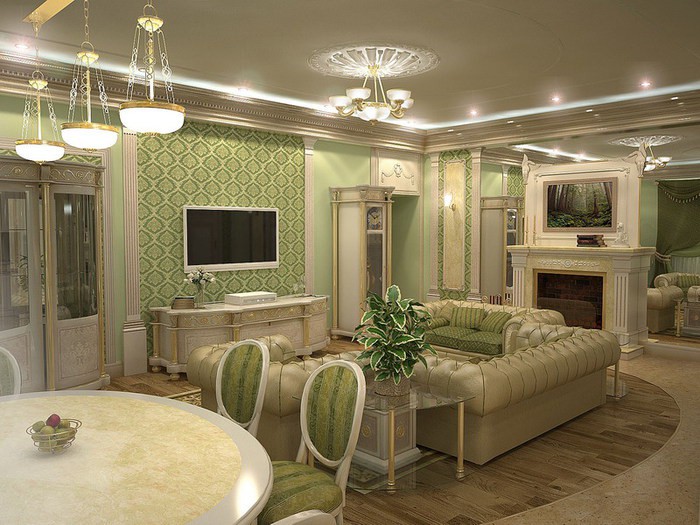 - Vous pouvez combiner du papier peint sur les murs avec de la peinture ou du plâtre décoratif. Surtout si la pièce est grande et que vous devez la diviser en zones, ou simplement débarrasser la surface des murs de la monotonie.