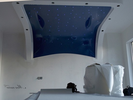 - Rouler dans le mur. Cela est possible en combinant la technologie des plafonds suspendus et des murs. La couleur et la texture du film sont choisies de telle sorte qu'après la pose pour obtenir une transition en douceur de la surface du plafond au mur. L'inclinaison et la forme du coude peuvent être effectuées par n'importe quel appareil adapté à un intérieur particulier.
