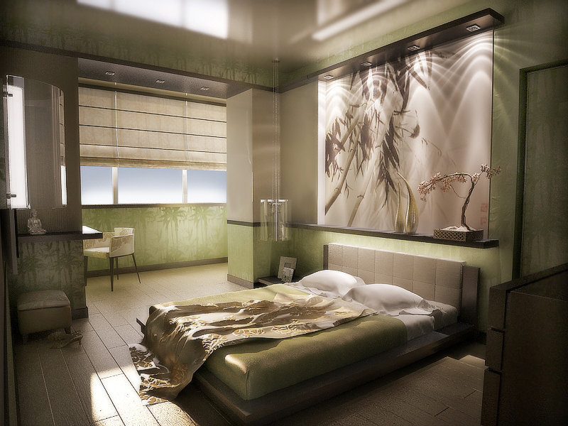 - Chambre lumineuse, dans laquelle la zone de la tête de lit est mise en évidence avec de la peinture. Une telle emphase agrandit visuellement l'espace et sert de toile de fond pour les articles de décoration et les accessoires.