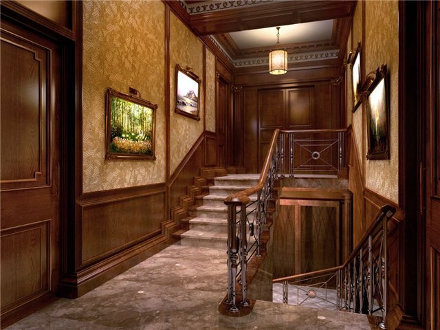 Le plus souvent, les panneaux de bois sur les murs se combinent avec décoration de papier peint ou plâtre décoratif. - Il existe des options avec des tissus d'ameublement, mais ils sont principalement utilisés pour la décoration de pièces dans des styles architecturaux tels que moderne, art déco, classique. Le style géorgien dans lequel l'intérieur présenté par nous est décoré est un type de style anglais.