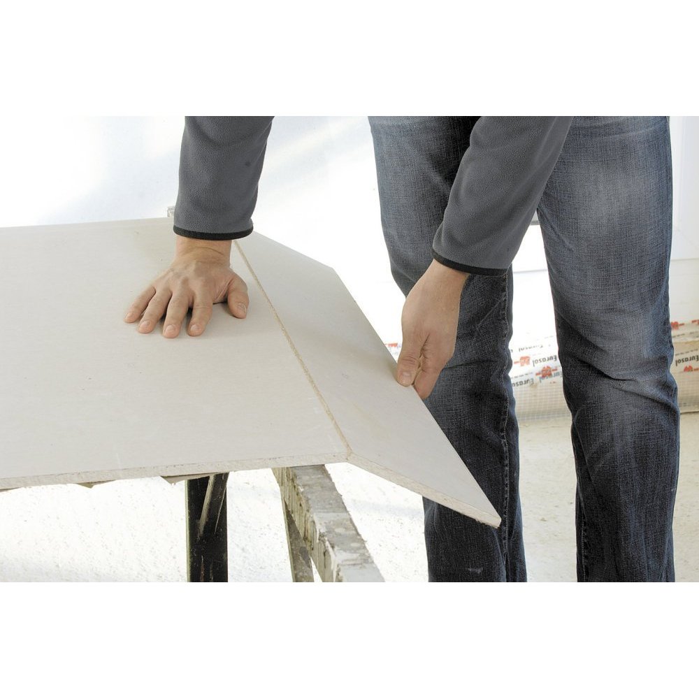 Astuce: les pièces curvilignes sont découpées dans la plaque de plâtre avec une scie à métaux étroite ou une scie sauteuse électrique. En ligne droite, il vaut mieux ne pas le voir, mais le casser, après avoir préalablement coupé le couteau dans une règle de 1/4 - 1/3 de l'épaisseur: de cette façon, il y aura beaucoup moins de poussière de gypse dans la pièce.