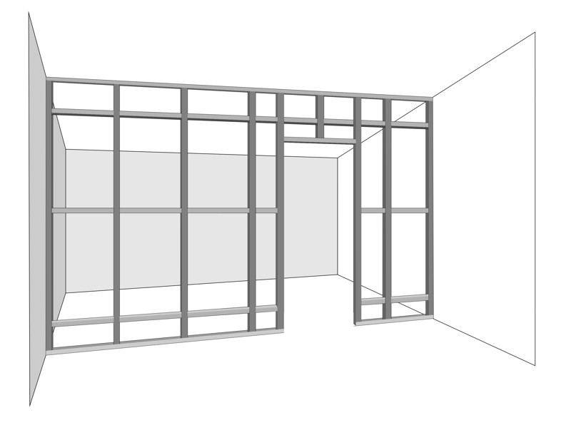 | Guider. Il est responsable de la fixation des supports aux structures majeures - le plafond, les murs adjacents et le sol. La largeur du profilé de guidage doit correspondre à la largeur des racks. La longueur totale des guides est égale au périmètre de la cloison avec une marge d'environ un mètre par garniture de bloc-porte. |