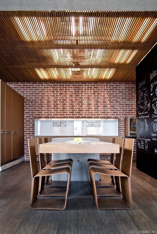 - Les meubles élégants dans le contexte d'un mur de briques sans prétention sont également très élégants. Dans notre exemple ci-dessus, un tel contraste est un plafond en aluminium à crémaillère avec un revêtement doré.