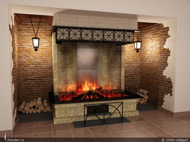 - Et voici une autre cheminée - à l'intérieur du salon, décorée dans un style méditerranéen. Seulement maintenant, le mur est recouvert de briques décoratives avec un relief "rock".