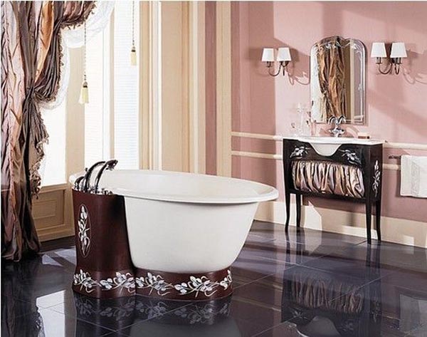 L'option de conception classique ne convient que pour une pièce spacieuse.. Ce style comprend des meubles sculptés massifs, des moulures en stuc avec dorure au plafond, une grande baignoire ovale avec une tête de lit surélevée et même un auvent au-dessus.