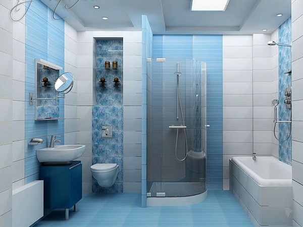 L'utilisation de carreaux de céramique rend possible une multitude d'autres options, il vous suffit de mettre votre imagination à rude épreuve. - Récemment, la décoration de la salle de bain dans les tons bleus est devenue très populaire. Cette couleur est associée chez l'homme à de l'eau pure: une source, la mer et permet de se détendre et de se reposer le plus possible.