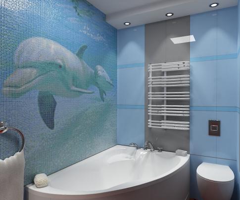Le panneau de mosaïque le plus avantageux sur le mur, représentant l'océan ou un aquarium. Un décor approprié pour une telle pièce serait le plafond tendu du "nuage".
