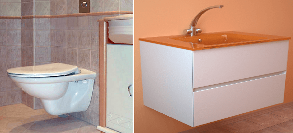 - La plomberie suspendue contribuera à libérer l'espace: une cuvette des toilettes et un lavabo. Cela permet non seulement de placer une bonne armoire sous l'évier, mais aussi de cacher les tuyaux et les tuyaux.