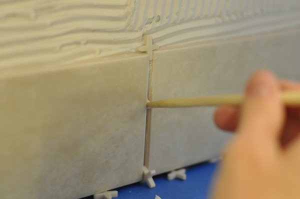 - Après un séchage incomplet de la solution adhésive, les croix de montage sont retirées des coutures entre la plaque en céramique et vous devez marcher le long de la couture avec l'angle d'une spatule. Il est nécessaire de retirer toute la solution. Lorsqu'il est complètement sec, cela ne fonctionnera pas;