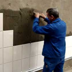 - Tout d'abord, l'adhésif pour carreaux est appliqué sur le mur à l'aide d'une spatule conventionnelle. Il est important de calculer correctement la zone sur laquelle la colle sera appliquée. Il est généralement recommandé d'appliquer de la colle sous 4 à 5 carreaux.