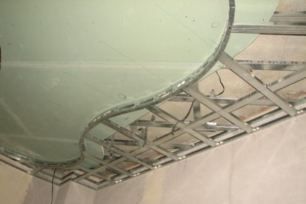 Lors de la fixation d'un profil, il vaut toujours la peine d'utiliser un niveau pour éviter les erreurs de taille et ne pas rendre le plafond inégal. - Pour la résistance structurelle, des cavaliers transversaux sont utilisés. Avant l'installation, les feuilles sont découpées, après les avoir mesurées.