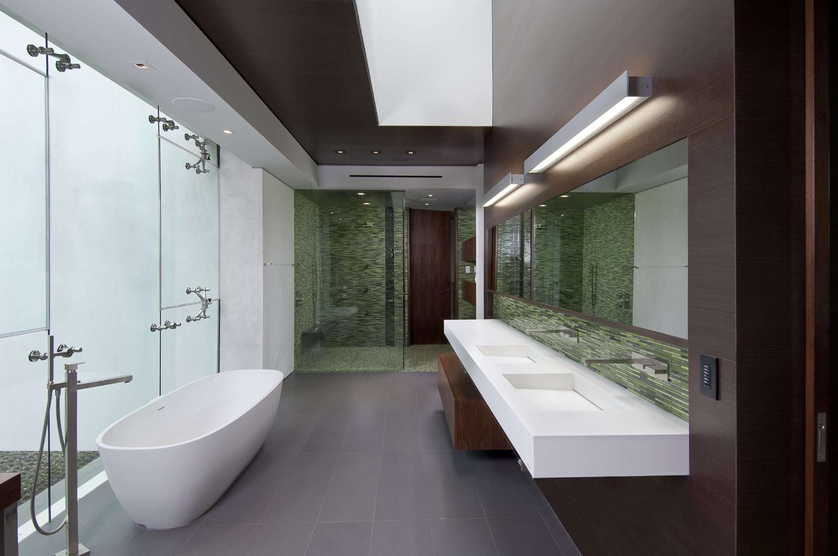Le même bois, mais uniquement sous forme de panneaux laminés lisses, rend l'intérieur plus moderne. Aujourd'hui, ils sont utilisés à la fois pour la décoration murale et pour l'aménagement de structures de plafond suspendu. Un insert en verre givré ou un beau vitrail coloré avec rétro-éclairage rendra toute salle de bain fabuleusement belle.
