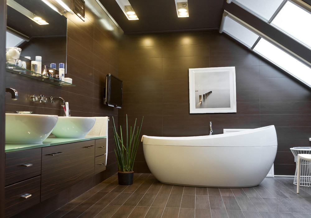 - Si sur les murs vous décidez de décorer totalement ou partiellement les structures portantes, il serait logique de faire de même au plafond. Et pourtant, vous devez vous concentrer sur les caractéristiques de conception du plafond ou du toit - selon l'emplacement des salles de bain.