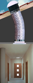 À votre demande, le fabricant peut monter une lampe électrique pour l'éclairage nocturne et un système de ventilation dans le tunnel. Le diamètre du plafond est de 35 ou 55 cm. Un tunnel lumineux suffit pour éclairer une pièce d'une superficie de 9-10 m². De plus, la qualité de l'éclairage ne dépend pas des conditions météorologiques - même avec une couverture nuageuse élevée, elle est comparable à la quantité de lumière d'une lampe électrique standard.