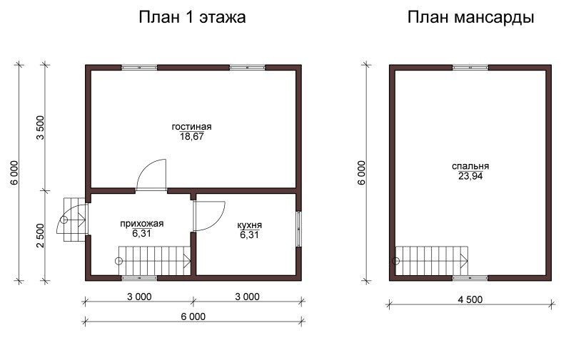 J'ai construit une maison de campagne, mesurant également 6 x 6 m. La disposition est la même, mais la cuisine a été agrandie grâce au hall d'entrée. Au deuxième étage, deux murs surélevés de 1,5 m et le grenier tourné sur toute la surface de la maison. Pour cette raison, ils ont réussi à organiser 2 chambres. Par conséquent, malgré la petite taille de la maison, il était possible d'y aménager 3 salons et une grande cuisine. Certes, la hauteur du mur jusqu'au plafond s'est avérée petite, mais des meubles rembourrés y ont été installés.